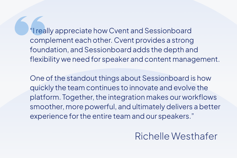 Speakers, sessions, and presentations are managed in Sessionboard—and when a speaker is added to an event, everything automatically syncs to Cvent.
