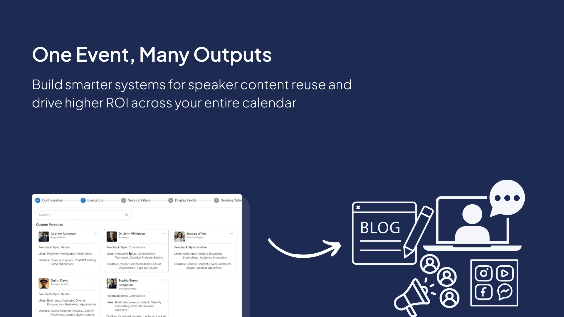 When it’s time to plan a webinar, launch a campaign, or pitch a speaker for a podcast, teams scramble to rebuild everything from scratch. They waste hours tracking down bios, rewriting abstracts, or searching for that one quote they know someone said. The opportunity cost is massive. Instead of fueling year-round engagement, your event content just sits there, collecting dust.