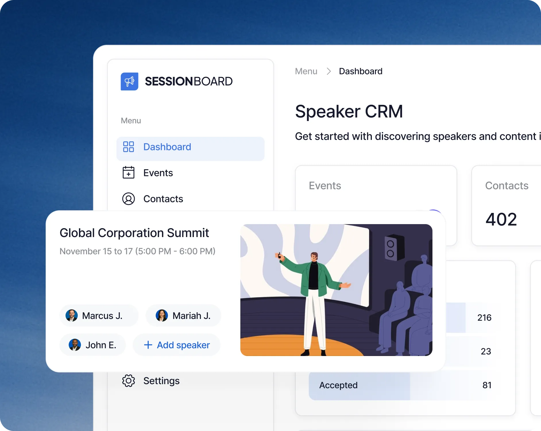 Turn great sessions into blog posts, webinars, or thought leadership — powered by a speaker CRM that remembers everything.